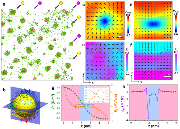 图3.极化布洛赫点的负电容效应的相场模拟结果。(a)负电容区域(绿色)和布洛赫点(红色)的分布;(b-f)布洛赫点的极化构型图和电场分布图;(g,h)穿过布洛赫点的极化、电场、介电常数分布曲线。