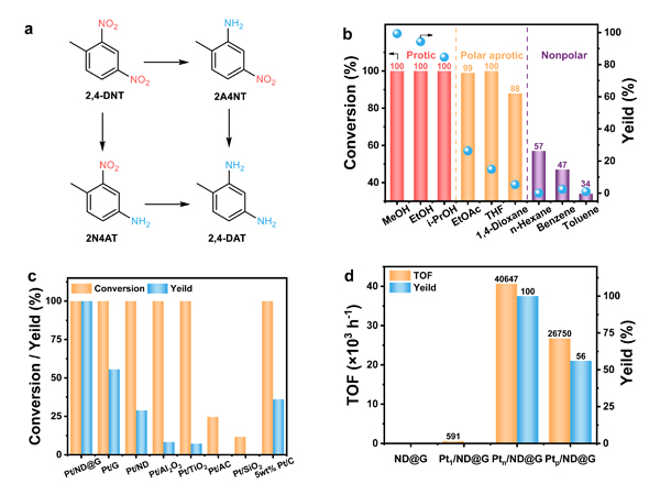 图2. 催化剂性能测试。a 2,4-DNT加氢路径,b反应溶剂考察,c不同载体性能对比,d不同结构Pt催化剂TOF和催化性能的关系。