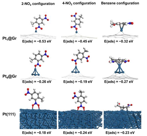 图3. DFT计算。2,4-DNT在Pt1@Gr、Pt4@Gr和Pt(111)上三种可能的吸附模式(2-NO2-构型、4-NO2-构型和benzene-构型)以及对应的吸附能。