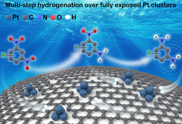 在本工作中,研究团队在富缺陷的纳米金刚石-石墨烯(Nanodiamond@graphene,ND@G)载体表面精准构建了Ptn团簇催化剂(Ptn/ND@G),通过球差电镜、XPS和X射线吸收谱(图1)等一系列手段进行了系统表征,证明Pt的全暴露团簇结构。在2,4-二硝基甲苯加氢性能测试中,比较了Ptn团簇、Pt1单原子以及Ptp纳米颗粒之间催化加氢性能的差异。在温和条件下,Ptn/ND@G催化剂在加氢反应中表现出了优异的催化活性(TOF= 40647 h-1)和选择性(图2),并可至少循环使用5次,展示出良好的循环稳定性。同时,Ptn/ND@G催化剂对含有不同官能团的二硝基芳烃多步加氢反应也表现出优异的催化性能。实验和密度泛函理论(DFT)计算表明(图3),Ptn团簇中多个活性位点之间的协同作用促进了硝基芳烃底物和H2的共吸附/活化;同时Ptn团簇对中间体和产物具有适度的吸附能力,从而使得该多步加氢反应具有优异的催化性能。此外,Pt单原子催化剂由于其单一活性位点难以同时吸附活化硝基芳烃底物和H2,表现出较低的活性。本工作构建了全暴露Pt团簇活性结构,同时实现原子利用率和反应性能的最大化,这为未来高效多步加氢催化剂的开发提供新的思路。