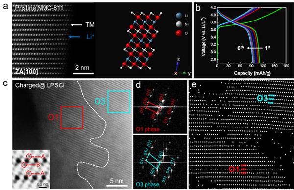 研究表明,全固态电池中的晶格失氧和局部应力耦合驱动的表面“晶格碎化”以及脱锂诱发的剪切相变共同导致了层状氧化物的结构性能退化。表面“晶格碎化”涉及纳米级多晶岩盐相的形成,这一失效模式系首次在层状氧化物正极材料中被发现。该研究还发现了区别于传统锂离子电池中层状正极的剪切界面新构型和大尺寸O1相的形成。这一研究拓展了层状氧化物正极的相变退化理论,有望为面向全固态电池的正极材料和正极/电解质界面优化设计提供重要理论指导。同时,该工作也凸显了先进电子显微学表征技术在解决能源领域核心科学问题中扮演的重要角色。