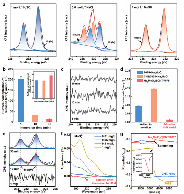 受鱼类在受到外部刺激时会通过腺体自发分泌粘液来进行自我保护的自然现象启发,王政彬提出了“内生沉淀剂为粘液,中空碳纳米管为腺体,毛细作用为分泌驱动力”的仿生设计策略,成功制备出高强高耐蚀的块体7075铝基复合材料,抗拉强度高达~700 MPa,耐晶间腐蚀、剥落腐蚀和应力腐蚀性能优异,其强度和耐蚀性的综合匹配超过了目前公开报道的其他铝合金(图1)。该材料在酸、碱、盐环境中均具有极低的腐蚀速率(图2),在强腐蚀性碱性介质中的腐蚀速率甚至比最耐蚀的纯铝还低133倍。优异的耐蚀性主要是因为毛细作用诱导沉淀剂自发从碳纳米管中溶出并在表面富集,形成保护性膜层(图3)。运用上述仿生策略同样研制出了兼具高强高耐蚀的2024以及6061铝基复合材料,表明该策略具有可拓展性,有望能研发出其他高强高耐蚀金属材料。