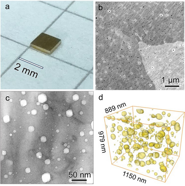 图1. 纳米孔弥散强化金(NVD Au):(a)样品实物图;(b)典型扫描电镜照片;(c)透射电镜照片;(d)三维重构图显示纳米孔的空间分布。