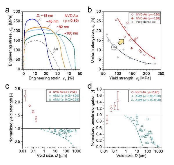 图2. 纳米孔弥散强化金(NVD Au)的力学行为:(a) 不同孔径NVD Au以及全致密参比样品的拉伸曲线;(b)两种样品均匀延伸率随屈服强度的变化;(c)屈服强度和(d)均匀延伸率随孔径的变化规律。AMM: 增材制造金属材料。屈服强度和均匀延伸率均以相应全致密态样品数据为基准进行了归一化。