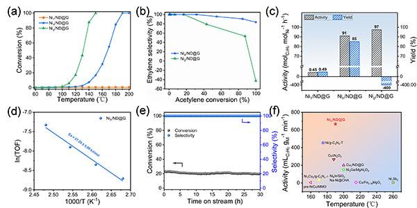 图2. (a-c)乙炔加氢催化性能测试 (d)催化剂活化能 (e)稳定性能测试 (f)与其他乙炔加氢催化剂的比较