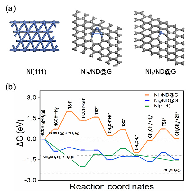 图3.(a)Ni颗粒、Ni团簇和Ni单原子催化剂的模型 (b)不同催化剂表面乙炔加氢反应过程路径计算