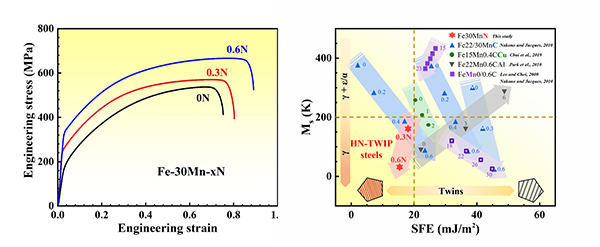 图1. 通过打破低层错能和高奥氏体稳定性的矛盾,高氮铁合金实现强度和塑性的同步提高