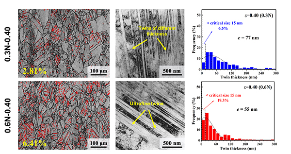 相关成果以“Simultaneous improvement of strength and plasticity: nano-twin construction for a novel high-nitrogen TWIP steel”为题,于10月5日在线发表于International Journal of Plasticity期刊。该研究工作得到了国家自然科学基金(面上项目、青年项目)等项目资助。