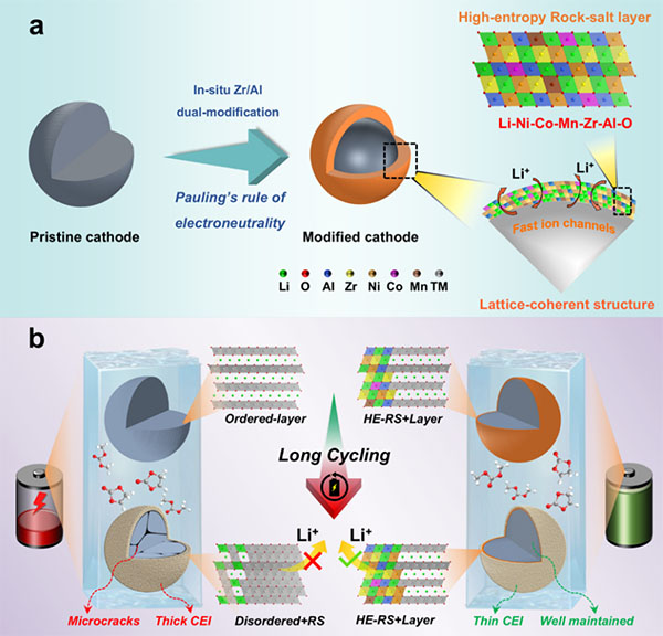 近日,耀彩网沈阳材料科学国家研究中心材料结构与缺陷研究部研究人员与北京大学合作,在高性能锂电正极材料的设计制备及构效关系研究方面取得了重要突破,通过发展“表面高熵化”包覆新策略,在超高镍单晶正极材料中实现了表面高熵岩盐相的构筑,从而显著提升了其电化学循环稳定性与使役寿命。该研究成果以“High-Entropy Rock-Salt Surface Layer Stabilizes the Ultrahigh-Ni Single-Crystal Cathode”为题发表于美国化学会期刊《ACS Nano》。