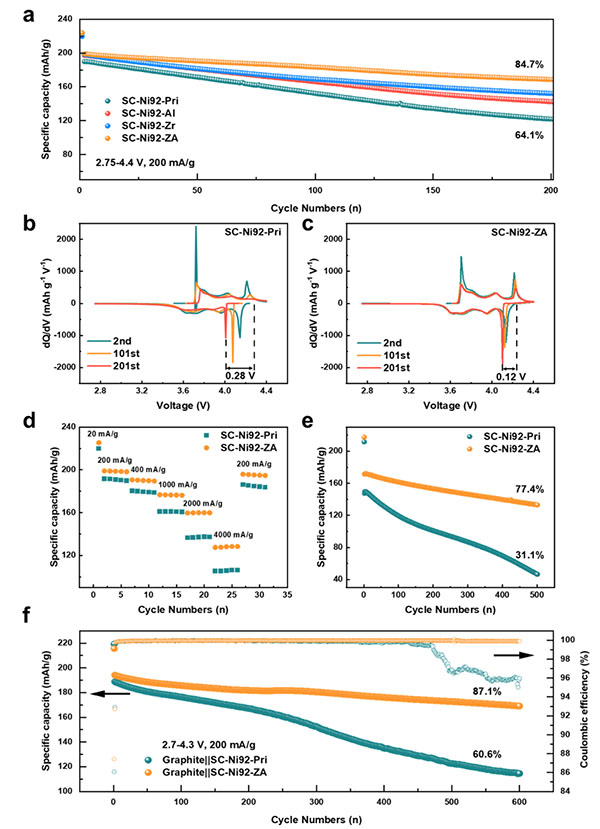 研究人员发展了一种基于鲍林电中性规则的“表面高熵化”策略。通过原位反应将诱发镍变价的锆、增强键能的铝引入超高镍单晶LiNi0.92Co0.05Mn0.03O2表面,从而实现晶格外延的高熵岩盐层构筑。电化学测试、理化性质分析和理论计算结果表明,“表面高熵化”具有以下两方面作用:1.抑制晶格氧损失、减轻界面副反应和减少电解液分解;2.增强锂离子扩散动力学、稳定H2-H3相变并抑制有害相变。由于动力学性能和界面稳定性的提高,该材料不仅展现出更高的可逆容量,而且在高温、高截止电压和超快充等极端条件下展现出使役寿命和快充性能的提升。例如,经过600次循环,“表面高熵化”的超高镍单晶容量保持率高达87%。该研究为提升超高镍单晶材料的能量密度和使役寿命提供了创新性的解决方案。