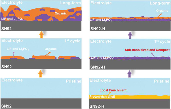 图1. 表面富质子包覆层原位转化为富无机保护膜的示意图