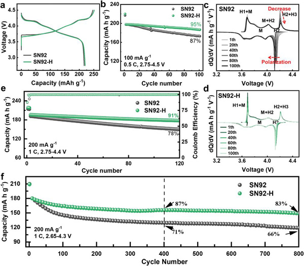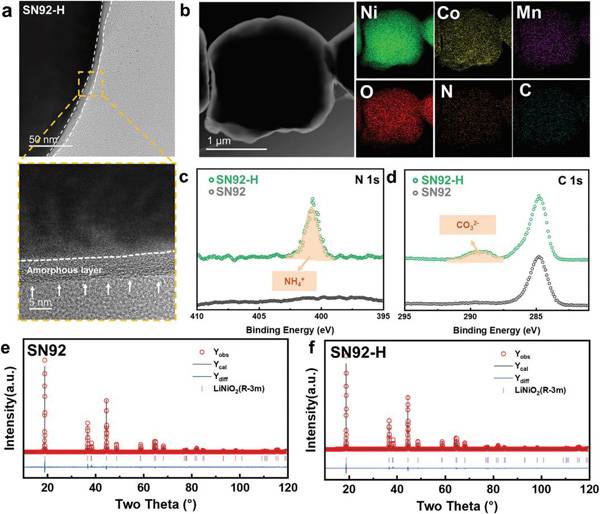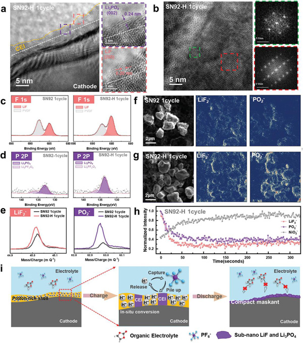 研究人员通过较低温度条件下原位CVD反应,在超高镍单晶LiNi0.92Co0.06Mn0.02O2表面构建了一层NH4HCO3壳层。在充电过程中,壳层原位转化为高效保护膜。首次充电时,NH4HCO3壳层电化学分解产生的局部高浓度质子,快速诱导少量电解质LiPF6分解,从而在正极材料表面原位形成富含亚纳米级LiF和Li3PO4的保护膜。该保护膜有效抑制了活性材料与电解液在长时间循环过程中的持续反应及正极材料界面结构的退化,从而显著提高了电池的使用寿命。例如,含该保护膜的正极与常规正极的全电池经过800次循环后,容量保持率分别为83%和66%。研究为电极/电解液的界面稳定化提供了新思路,也有望为下一代高性能长寿命锂离子电池的开发提供重要理论支撑。