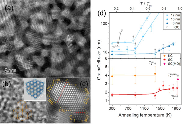 图2. (a)-(c)纯Pt中晶粒尺寸为2-3 nm的Schwarz晶体结构表征;(d)不同初始晶粒尺寸纯Pt样品的晶粒尺寸随温度变化关系,KC:Kelvin晶体,SC:Schwarz晶体
