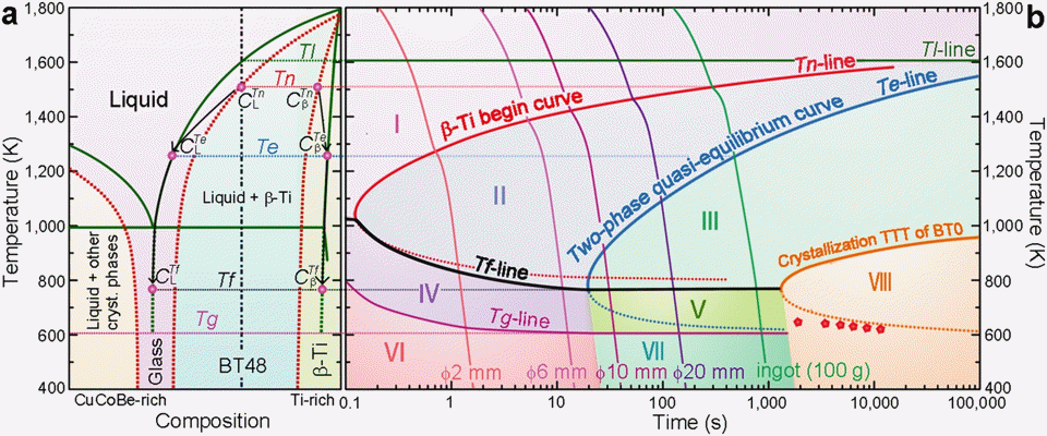 1.非晶合金复合材料的形成机理研究。建立了非晶内生β-Ti复合材料的“两相准平衡凝固理论”,为调控这类复合材料的微观组织提供了理论基础 [Sci. Rep. 6 (2016) 19235];发现了特定亚稳β-Ti合金的晶粒内部出现非晶相,提出了“马氏体非晶化”固态相变新机制,研发了具有晶内非晶相的新型非晶合金复合材料 [Nat. Commun. 9 (2018) 506];发现了凝固过程中过冷熔体对内生亚稳β-Ti晶体的负熵稳定效应,并揭示了其对复合材料中相结构演化的影响 [Scripta Mater. 125 (2016) 19];研究了连续升温过程中“非晶-晶体”双相复合材料的形成过程,并建立了连续升温转变相图 [Scripta Mater. 254 (2025) 116339]。