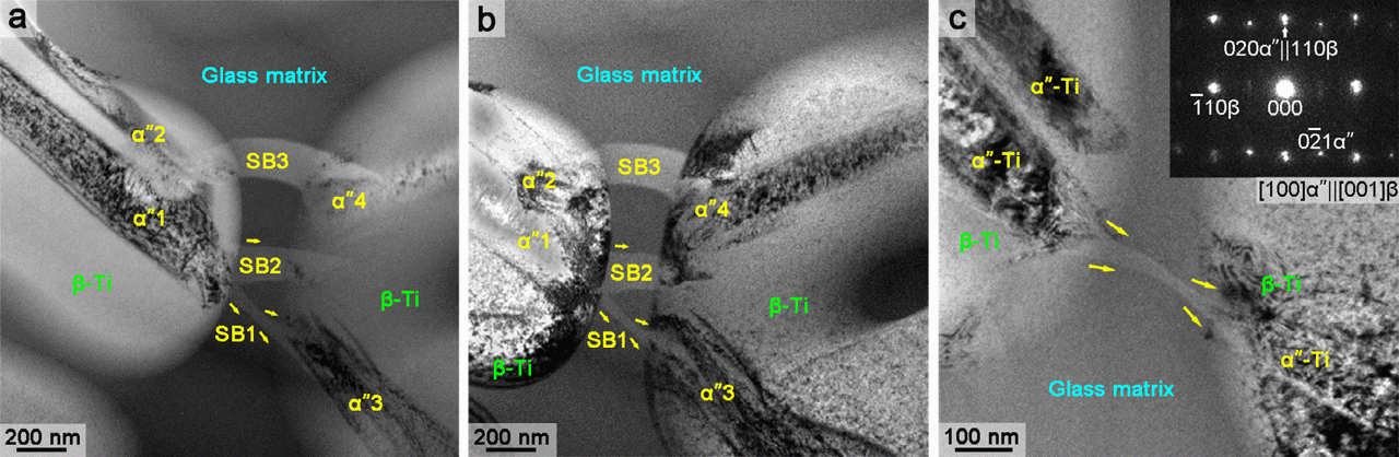 3.“非晶-晶体”双相协同变形机制研究。揭示了内生亚稳β-Ti晶体中不全位错滑动导致出现ω-Ti带,晶体中ω-Ti带可与非晶剪切带连贯地传递剪切应变,实现了“非晶-晶体”协同剪切变形,该发现不仅丰富了材料塑性变形机制,也为开发兼具拉伸塑性和剪切破坏方式的高释能非晶合金复合材料提供了理论基础 [Phys. Rev. Lett. 125 (2020) 055501];发现了非晶合金复合材料中晶体的不同变形机制可以显著改变非晶剪切带的性质与行为,在粗大马氏体板条作用下,非晶剪切带厚度不断增加,不再熟化,并在扩展中倾向分叉,提出了“剪切带钝化”新概念,为通过剪切带性质调控非晶合金复合材料的性能奠定了理论基础 [Acta Mater. 241 (2022) 118422]。