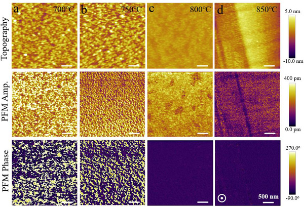 图1. BaTiO3单晶薄膜自发极化铁电畴随生长温度的演化