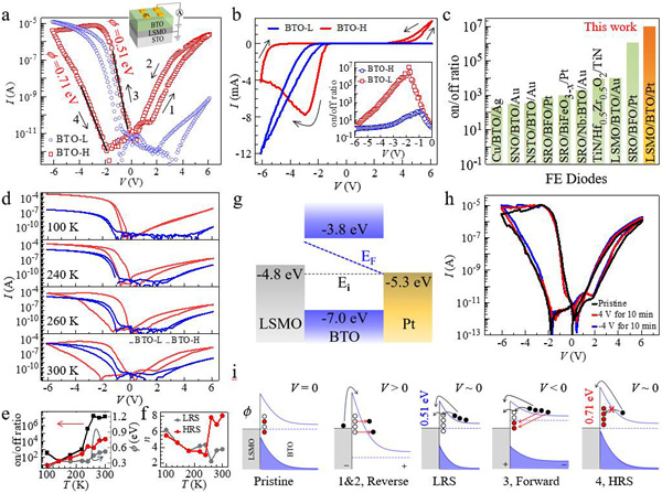 图4. La0.67Sr0.33MnO3/BaTiO3/Pt 铁电忆阻器的性能与阻变机制