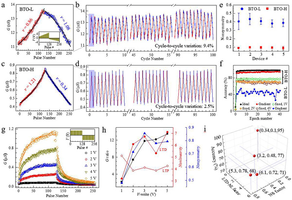 图5. La0.67Sr0.33MnO3/BaTiO3/Pt 铁电忆阻器的类神经突触行为与监督学习性能