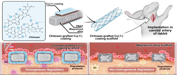 相关成果以“A high-performance chitosan-grafted Cu(II) coating improves endothelialization and mitigates the degradation of biodegradable magnesium alloy stents”为题,于1月29日在线发表在Biomaterials。该研究工作得到了国家自然科学基金等项目的支持。