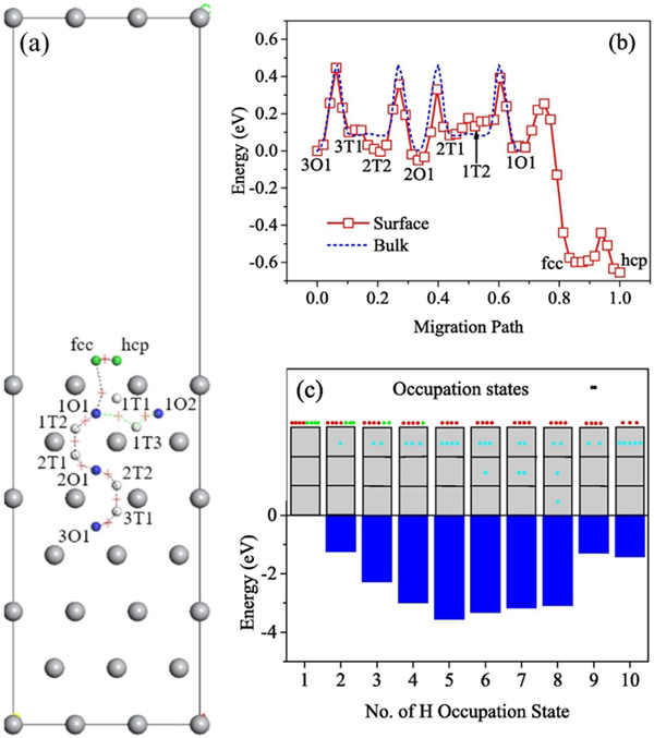 图1. 氢原子倾向于向Ti表面扩散:(a)路径,(b)势能曲线以及(c)不同分布状态下的相对能量。