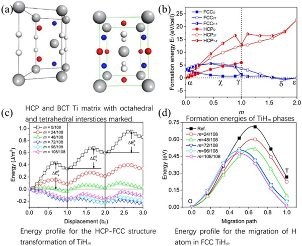图2. (a) HCP-Ti以及FCC氢化物的BCT视角,(b) 不同氢掺杂方式的α-Ti和TiHm 形成能,(c) α-Ti→TiHm相结构转变势能曲线,(d) 相变中的氢原子扩散势垒。