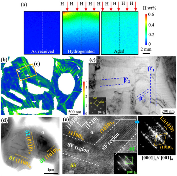 图3. (a) 中子成像氢分布图,(b,c) β相中条幅分解片层形貌,(d,e) α相中氢化物及亚稳过渡相形貌。