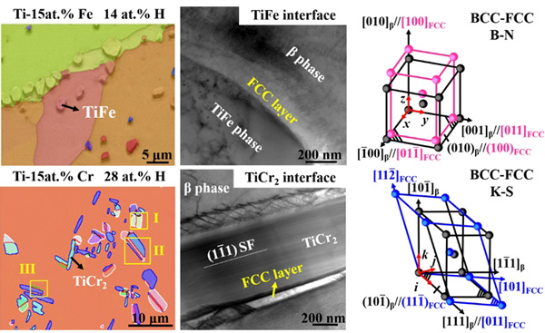 图4. 氢诱发TiFe和TiCr2相,相界面处的FCC层以及β相与FCC相间的取向关系。