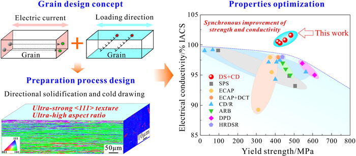 提出强度-导电率定量关系模型:基于金属导线服役时位错滑移和电子输运与晶界交互作用机理,提出了晶粒宽度主要影响强度,晶粒长度主要影响导电率,进而提出了“细长晶粒”设计高强-高导原理,采用“超细长晶”技术成功实现了若干纯铝/铜导线强度和导电率同步提升,打破了强度-导电率之间制约关系(图1)。进一步地,根据提出的物质传导定律:即物质通量密度与载荷梯度成正比,将细长晶粒特征晶界与基体进行串-并联建模,推导出细长晶粒、晶界特征与导电率和强度定量关系,澄清了垂直晶界和平行晶界长径比、数量以及尺寸对强度和导电率的定量影响机理,建立了细长晶粒晶界空间分布特征参数与强度σgb和导电率E之间定量关系模型: