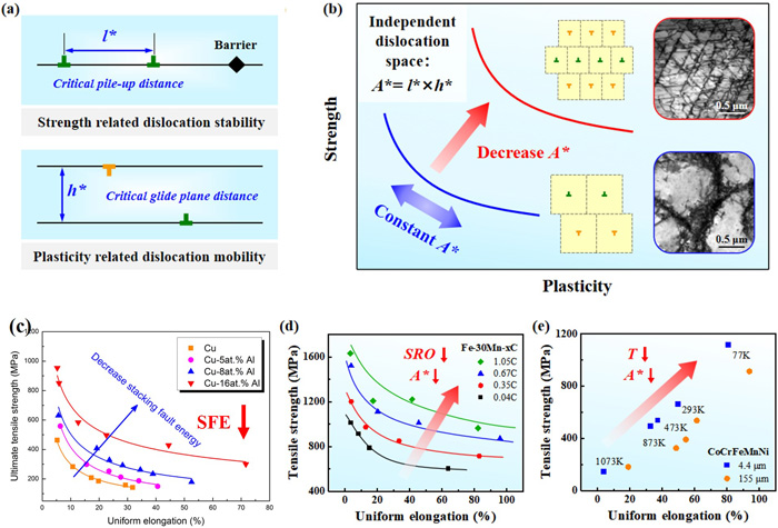 提出位错运动临界独立空间模型:以金属材料中影响强度-塑性关键因素—位错如何运动作为切入点,通过分解其在不同方向上的临界距离,提出平行于滑移面方向的临界塞积距离影响强度,而垂直于滑移方向的临界捕获距离影响塑性,计算模拟发现对于Al、Ag、Cu、Ni等纯金属,二者乘积恒定,该恒定值代表不同金属中位错运动临界独立空间大小A*,反映了金属材料本征强度-塑性水平。位错运动临界独立空间的提出揭示了金属材料强度-塑性相互制约的内在原因。大量实验发现:通过合金化降低层错能、增加短程有序和降低温度可减小位错运动临界独立空间,实现强度-塑性同步提升(图3),该研究结果发表在Liu R (刘睿等) Journal of Materials Science & Technology,224 (2025) 239-244上。