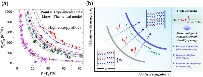 其中,σb和εU分别表示拉伸强度和均匀延伸率。对比大量实验结果发现:该制约关系定量模型与大量金属材料拉伸强度-塑性实验数据相符,如图4(a)所示。该模型表明:不改变金属合金成分,单纯通过调控晶粒尺寸难以同步提升其强度和塑性水平。同时模型中三个材料参数对应于强度-塑性协同提高的三个机制:1)增加位错本征滑移阻力;2)改善界面强度;3)促进滑移均匀化;建立的强度-塑性制约(trade-off model)关系定量模型总结如图4(b)所示,该研究结果发表在Li XT (李孝滔等) Acta Materialia 289 (2025) 120942上。