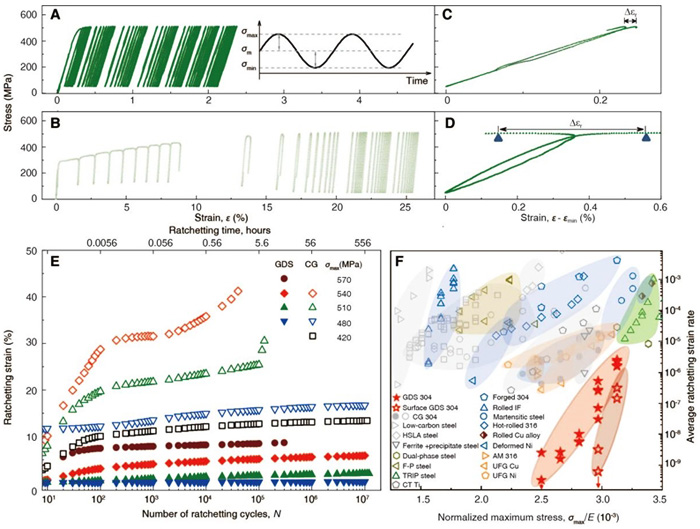 图1 梯度位错结构(GDS)304奥氏体不锈钢的循环蠕变行为。 (A,B)非对称拉-拉循环载荷工况(应力比为0.1)最大应力σmax=510 MPa 时GDS (A)和粗晶(CG) (B)典型应力-应变响应特征。(C,D) GDS和CG典型的滞后环,为方便比较,滞后环最小应变平移至坐标零点;Δεr代表单个周次内的循环蠕变量;(E) 不同σmax时GDS和CG样品的棘轮应变-周次曲线;(F) 平均棘轮应变速率与归一化σmax曲线,表明梯度位错结构具有优异的抗棘轮损伤能力,其平均棘轮应变速率较相同强度的不锈钢及其他合金降低2-4个数量级。