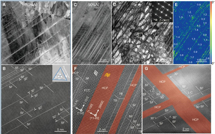 图2 梯度位错结构(GDS)304不锈钢σmax = 570 MPa循环蠕变过程中的结构演变特征。(A,B) 10%Nf 时SEM (A) 和 HAADF-STEM (B) 结果表明诸多微米尺度变形带(纳米层错)穿过多个位错胞;(C,D) 90%Nf 时SEM (A) 和TEM (B) 结果表明更高密度变形带穿过了位错胞群,且位错胞依然稳定存在;(E) 取向分布图显示变形带穿过的位错胞群取向差均属于小角范畴,与初始态相当;(F) HAADF-STEM结果表明微米尺度变形带由超高密度的HCP-FCC 纳米层片和层错结构组成;(G) 相互交割的HCP 纳米层片、层错和L-C 位错锁组成的更加细化的三维网络结构。