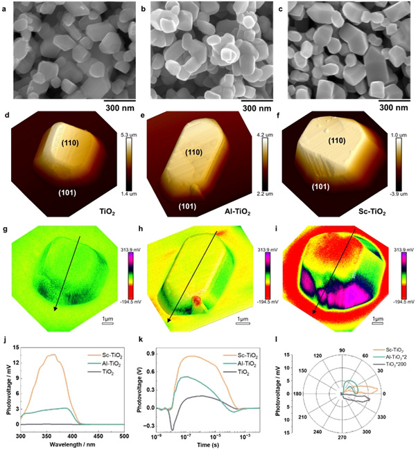 所制备得到的Sc掺杂二氧化钛的光生电荷分离效率(表面光电压)提升了200余倍(图2j),对波长360 nm单色光激发产生的光生电荷的利用效率提升到了30%以上,而与其他报道的TiO₂样品相比,在相近测试条件下性能提升了15倍以上,创造了TiO₂基光催化材料的性能新纪录(图3)。
