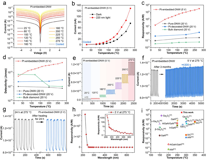 图4. 单晶金刚石纳米线光电探测器的高温日盲紫外光电探测性能