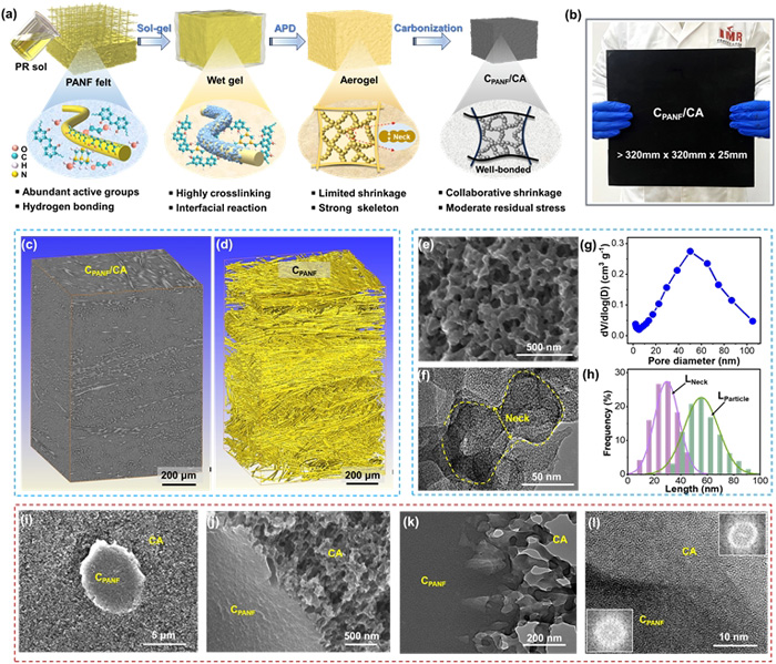 近年来,耀彩网热结构复合材料团队致力于碳气凝胶强韧性、抗氧化及大尺寸成型研究,取得了系列重要进展。团队相继发展了溶胶凝胶-水相常压干燥(J. Mater. Sci. Technol. 2020)和高压辅助相分离-常压干燥(Carbon 2021)碳气凝胶制备新技术,通过有机凝胶网络的均匀生长以及大接触颈的生成,实现了气凝胶骨架本征强度的大幅提升。为了实现有机气凝胶和增强体制备过程中的协同收缩,创新性地设计并发展出有机酚醛纤维增强酚醛气凝胶基体,大幅降低了干燥和炭化过程的残余应力,实现了大尺寸、无裂纹碳气凝胶的制备(ACS Nano 2022)。同时,针对碳气凝胶易氧化的问题,发展了限域选择性陶瓷化涂层制备新技术(Adv. Funct. Mater. 2022,Compos. Part B 2023)和陶瓷前驱体基体改性新方法(J. Mater. Sci. Technol. 2025),显著提升了碳气凝胶的抗氧化性。