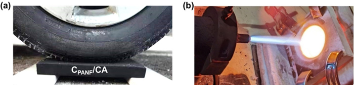 研究发现,聚丙烯腈纤维(PANF)固有的柔韧性和热软化特性可促进纤维和基体干燥和炭化过程的协调变形,进而缓解了残余应力,阻止了界面脱粘。PANF表面丰富的氰基官能团通过与前驱体溶液形成氢键,促进了两者间的浸润和粘附,同时通过原位界面反应在纤维和有机气凝胶基体之间形成化学键,进而获得原子级结合的纤维/基体梯度过渡界面结构。由此制备的材料具有优异的力学性能和隔热能力,压缩强度高达~90 MPa,比压缩强度达~150 MPa⋅g-1cm3,热导率低至0.35 W m-1 K-1。特别值得一提的是,因其优异的强韧性,研究团队首次获得了气凝胶材料的断裂韧性达1.01 MPa⋅m1/2,与致密玻璃或核级石墨相当;同时,该材料还具有稳定的裂纹扩展行为,表现为上升的R曲线,可耐约1.6t重汽车的碾压而不发生结构损坏。这一研究成功开发出高损伤容限碳气凝胶材料,可为新一代航空航天飞行器极端环境用热防护系统的设计提供突破性的材料解决方案。