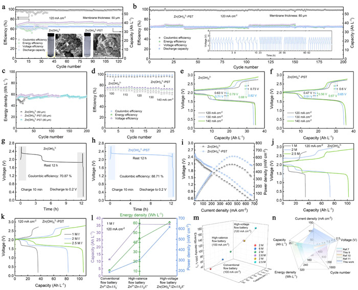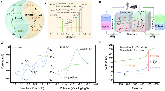 近日,耀彩网腐蚀基础与前沿研究部腐蚀电化学课题组唐奡研究员和李瑛研究员,在高性能锌碘液流电池研究方面取得重要进展。研究团队创新性提出锌负极碱性电解液环境与碘正极多电子转移路径协同优化策略,通过构建Zn(OH)42−/Zn负极与I−/I2/I+正极,成功研制出开路电压达2.385 V的锌碘液流电池(图1),对发展高能量密度电池具有重要理论和实践意义,相关成果以《A high-voltage alkaline zinc-iodine flow battery enabled by a dual-functional electrolyte additive strategy》为题,发表于《Advanced Functional Materials》,博士生杨静为论文第一作者。