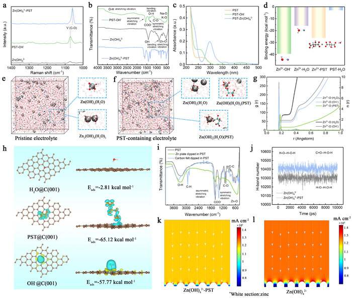 该研究在设计高电压锌碘液流电池基础上,通过在碱性锌负极添加同时具备含氧功能性官能团以及电荷载体的酒石酸钾钠,实现了对电解液离子结构-电极界面传质行为的有效调控,电池输出功率密度达到了616 mW cm−2,有效提升了22.8%,并在140 mA cm−2电密运行下实现了71.5%的能量转换效率。更重要的是,2.5 M高浓度电解液可在120 mA cm−2下有效提升容量及能量密度至105.98 Ah L−1和185.18 Wh L−1(图2)。材料表征结果表明,酒石酸钾钠显著调控了锌离子的原始配位平衡,加速了脱溶剂化过程。同时,酒石酸钾钠在电极表面优先吸附形成屏蔽层,均匀诱导了锌离子迁移通量,优化了电流密度分布,克服了枝晶生长及死锌累积的缺陷。此外,酒石酸钾钠通过氢键相互作用破坏了水分子间的原始氢键网络,减少了电解液中自由水的数量,显著抑制了析氢副反应(图3)。本研究通过理论计算与多尺度表征技术联用,从分子-介观-宏观多维度揭示了界面传质过程与反应动力学的协同优化机制,为新一代液流电池技术中高可逆金属负极的工程化开发与应用提供了新的技术路径以及理论指导。