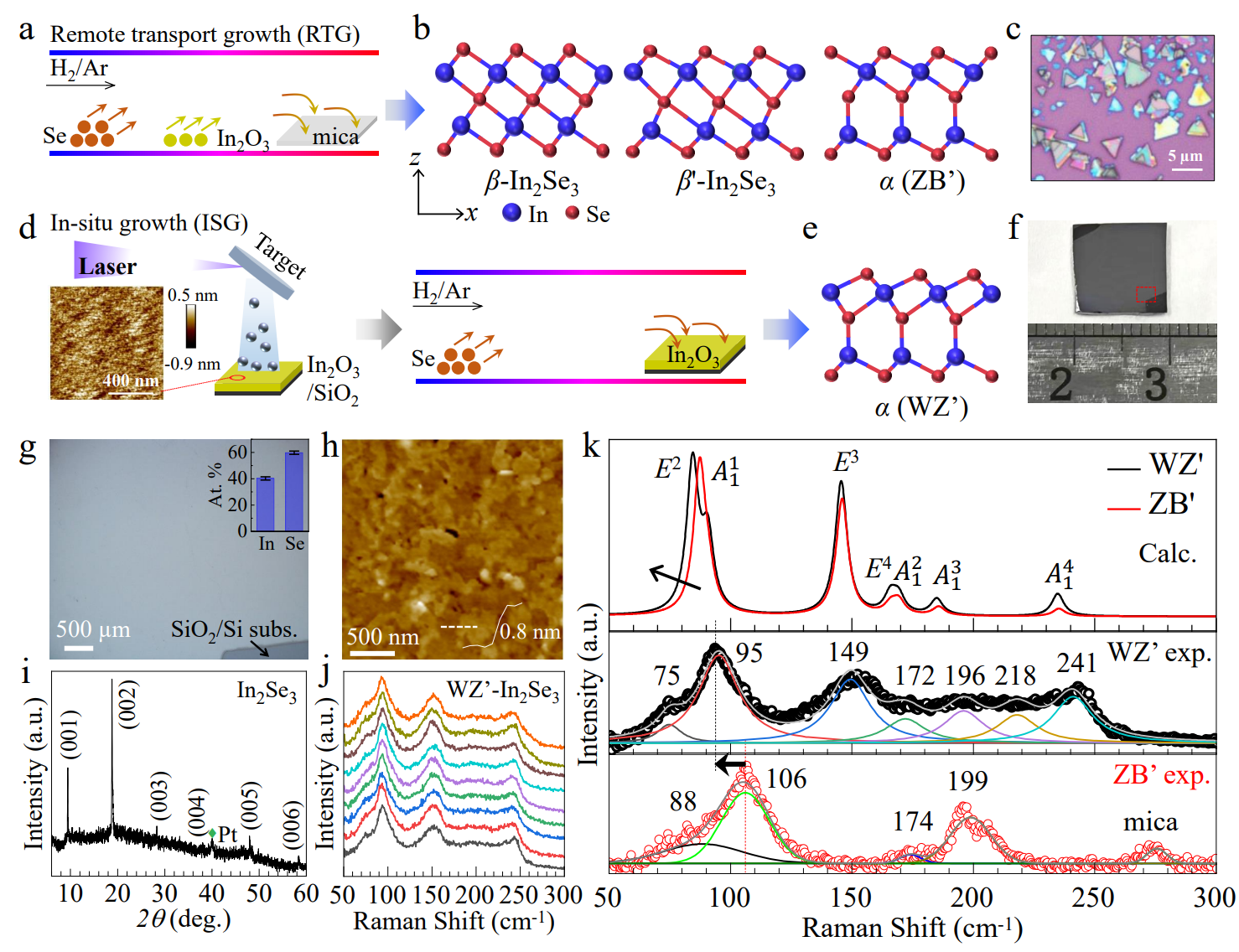 图1. 硅晶圆上纤锌矿型α-In2Se3薄膜的原位输运生长