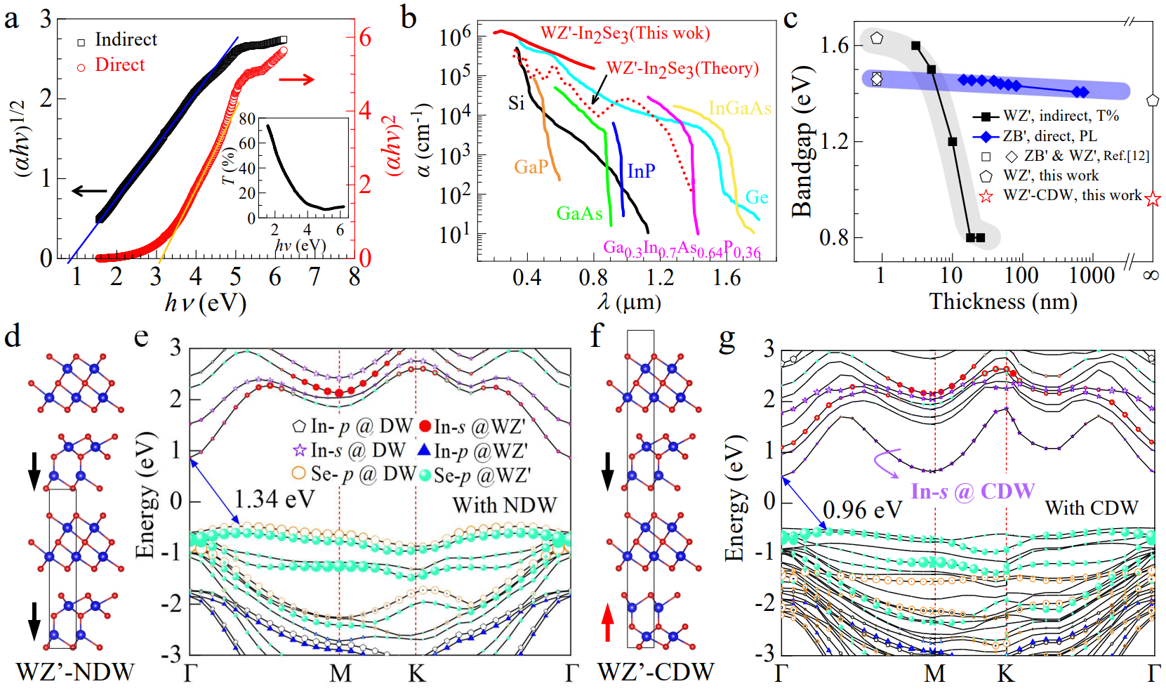 有趣的是,光吸收性能表明纤锌矿型α-In2Se3为间接带隙半导体,其带隙呈现显著厚度依赖性:单层带隙约为1.6 eV,厚膜带隙降低至0.8 eV。理论计算表明,带电畴壁可在导带底引入额外的能带是带隙缩减的主导机制。得益于窄带隙,材料展现出优良的光吸收性能,其光吸收系数在紫外波段(244 nm)达1.3×10⁶/cm,超越硅、砷化镓等传统半导体材料(图3)。