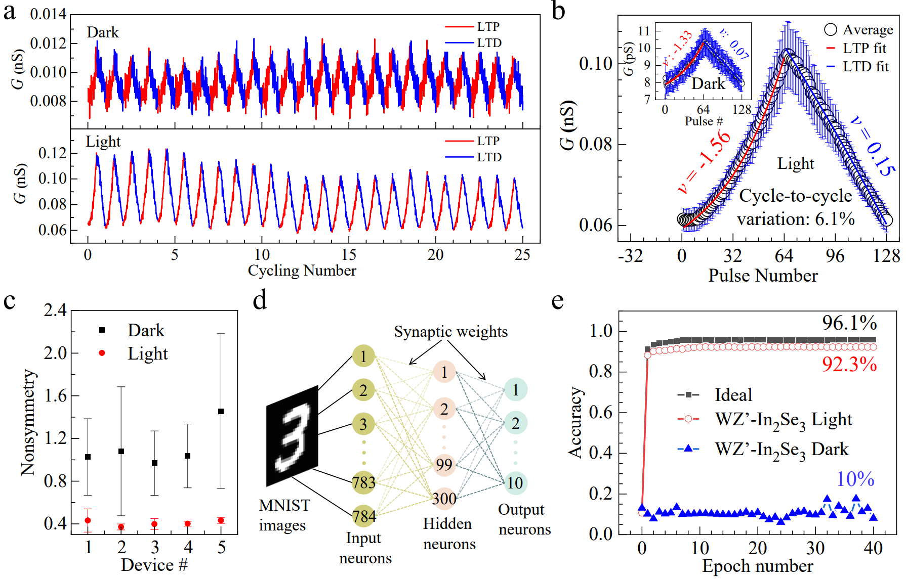 利用材料独特的铁电和光敏特性,研究人员进一步构建了基于Pt/WZ’-In2Se3/Pt结构的面内类神经突触器件。其I-V特性曲线展现和铁电极化翻转相关的瞬态电流峰,其翻转电压同扫描频率呈指数关系。该电流峰源于铁电畴翻转及其驱动的电荷注入与俘获效应(图4)。通过电压脉冲,研究人员可精准调控器件电导态,以模拟生物神经突触的长时程增强和长时程抑制特性。进一步利用可见光辐照,可显著提升器件动态电导范围、线性度与对称性,使其在神经形态计算的监督模式分类任务中实现92.3%的高识别准确率 (图5)。