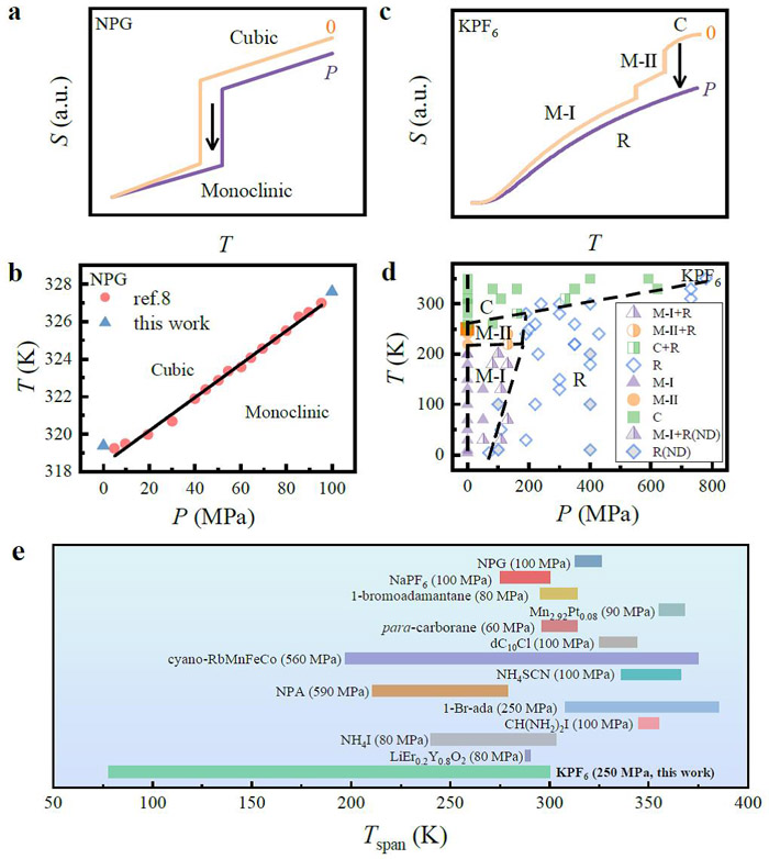 图1.传统压卡效应与全温区压卡效应的比较。新戊二醇的熵-温度曲线示意图(a)和高压相图(b),KPF6的熵-温度曲线示意图(c)和高压相图(d),代表性压卡材料制冷温区的对比(e)。
