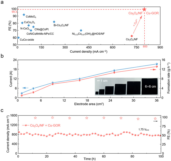 针对该挑战,耀彩网太阳能与氢能材料研究团队提出了一种通过引入Cu2+抑制过渡金属氧化物表面非晶化的新策略(Cu-GOR)。相关研究结果表明,在电解液中添加微量Cu2+(相当于反应物浓度的1%),利用Cu2+/Cu+在电催化氧化过程中的可逆氧化还原,可有效维持催化材料晶体结构的稳定性,抑制过渡金属氧化物催化材料的表面非晶化过程。以泡沫镍负载Co3O4催化材料为例,在800 mA cm−2的工业级电流密度下,Cu2+的引入使目标产物甲酸的法拉第效率从62.2%提高至99.3%,性能显著优于已报道的催化材料。同时,该催化材料和反应体系易于放大,6×6 c㎡电极材料的甘油氧化产物收率达到13.2 g h−1,稳定性超过100小时。该策略还可扩展至其他过渡金属氧化物(如镍基材料)及多种生物质电氧化反应体系(如5-羟甲基糠醛电氧化),为推进生物质电催化技术在绿色氢能产业中的应用提供了新思路。