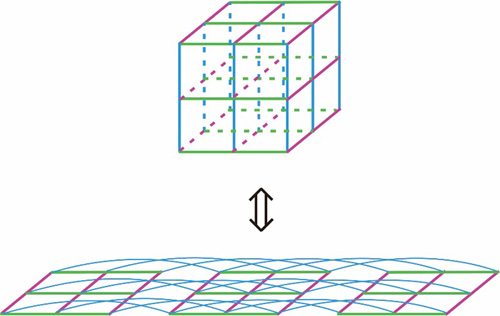 图1. 3×3×3晶格点的三维伊辛模型映射到(3×3+3×3+3×3)二维性格点的自旋排列。三维多体相互作用模型的三维特征与量子统计物理中转移矩阵的二维特征之间的矛盾导致非平庸结构和长程自旋量子纠缠。