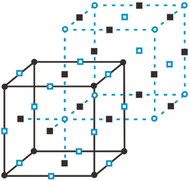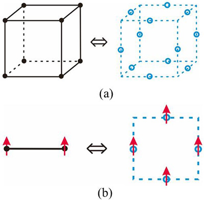 图3(a). 三维伊辛模型与三维Z2格点规范模型晶格之间的映射。(b)三维伊辛模型两点自旋相互作用与三维Z2格点规范模型四点自旋相互作用的映射关系。