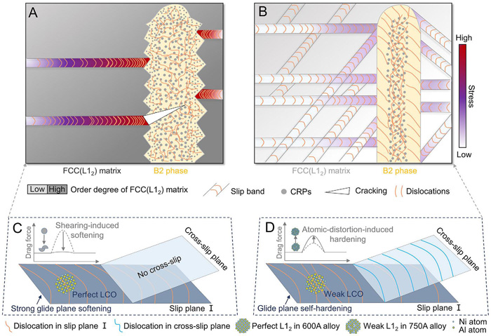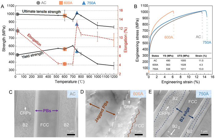研究团队结合多尺度表征、第一性原理计算及深入分析,系统揭示了高熵合金的“韧-脆-韧”转变机制。1)L12过有序+锯齿状相界的协同脆化:研究表明,中温时效诱导L12发生过有序化,同时形成锯齿状的B2/FCC(L12)相界。一方面,L12过有序导致高度局域化的平面滑移带;另一方面,锯齿状的非共格相界严重阻碍位错跨越界面滑移,导致界面处产生应力集中。当高度局域化的平面滑移带冲击这些滑移传递不利的相界面时,局部应力迅速超过B2相的断裂极限,诱发脆性断裂。2)L12有序度降低+韧性过渡界面的协同韧化:在非脆性温度区间时效时,高扩散能力使得L12有序度降低,激活多滑移与交滑移,显著提升合金的均匀变形能力。更关键的是,锯齿状界面转变为平滑界面,并在B2/FCC(L12)相界附近形成富Cr析出相缺失区(CRPs-free zone)。该区域内的富Cr相(CRPs)在热作用下溶解消失,形成韧性过渡区,使B2相边缘与FCC(L12)基体的变形能力更为匹配,有效缓解界面应力集中。从而显著抑制局域变形和脆性开裂倾向,展现出优异的强塑性。