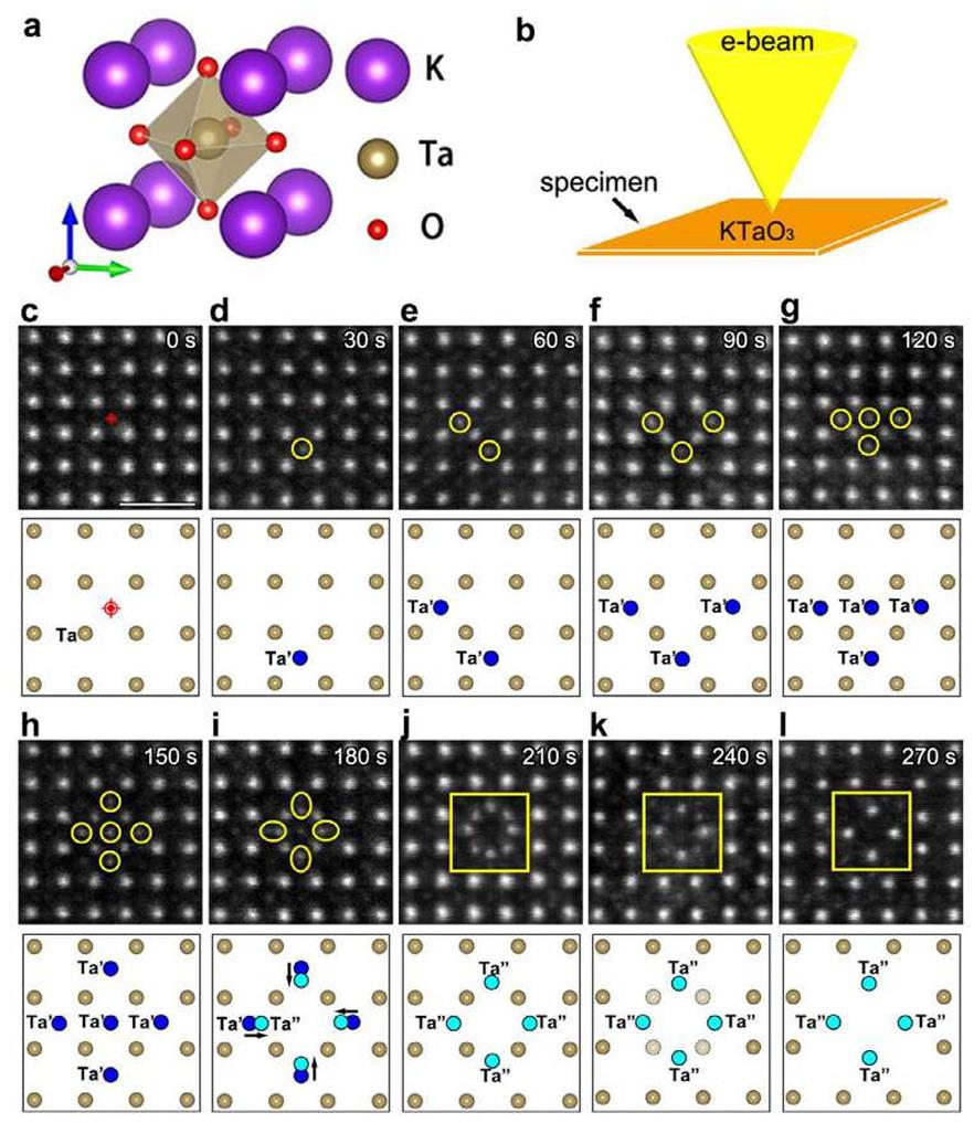 图1. (a) KTaO₃结构示意图 (b) STEM模式下电子束辐照示意图 (c-l) 电子束辐照下原子运动与结构转变