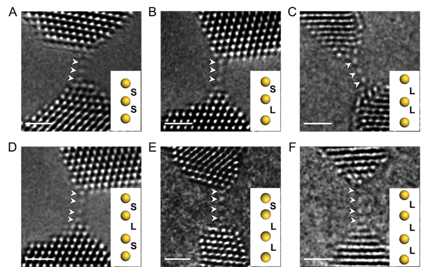 图1. 不同构型原子链的像差校正高分辨透射电子显微图像。