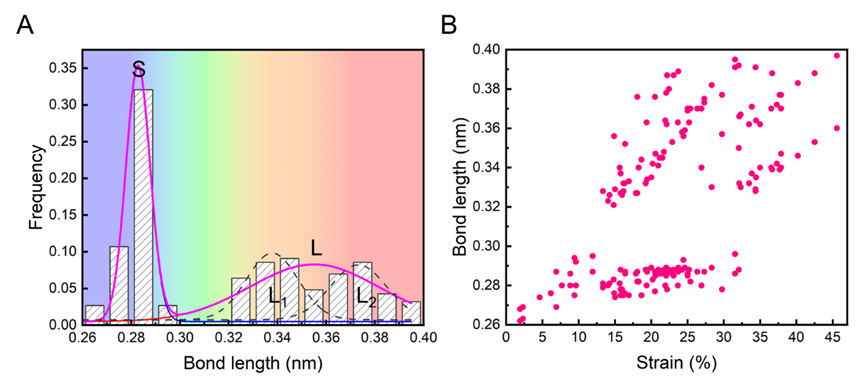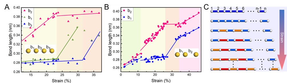 图3. 原子链上各原子键长随着应变的变化行为。低应变阶段,所有键长线性均匀伸长;当应变超过12%,部分键长优先从S态伸长至L态,其余键长暂时维持S态;最后,剩余的S态的键长随着应变得进一步增加,分布伸长至L态。