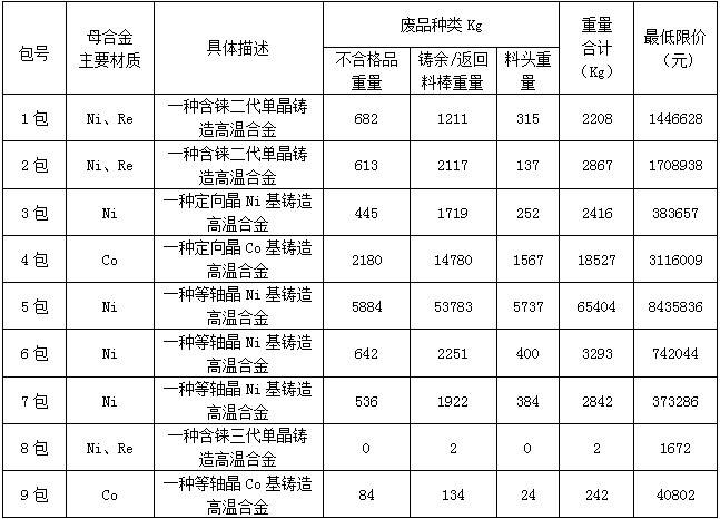 1.规模:高温合金母合金废品,具体详见下表: